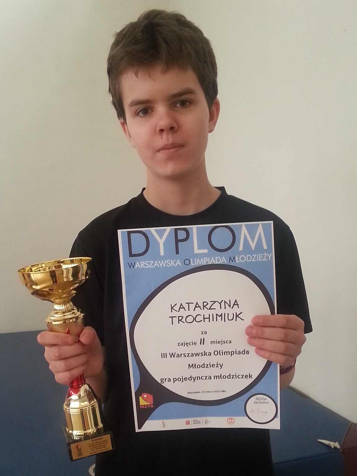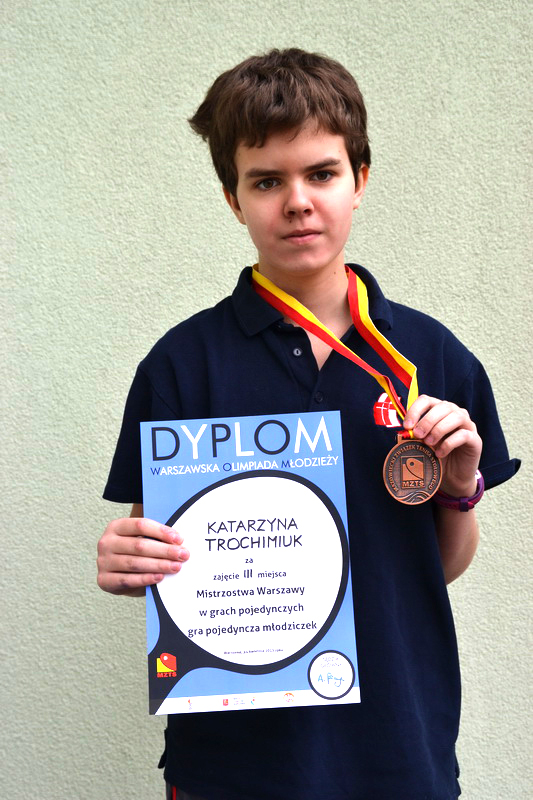 Katarzyna Trochimiuk, uczennica klasy 6b zajęła III miejsce podczas Mistrzostw Warszawy w grach pojedynczych młodziczek. Zawody rozegrano 14 kwietnia 2015 roku. Więcej informacji:http://mzts.pl/aktualnosci/julia-wieckowska-i-lukasz-sokolowski-mistrzami-warszawy-mlodzikow Serdecznie gratulujemy 🙂