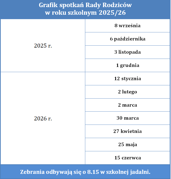 W Radzie Rodziców jest reprezentant/ka każdej klasy wybierany/a na początku roku szkolnego podczas pierwszego zebrania.